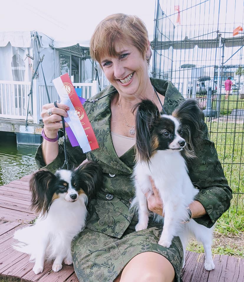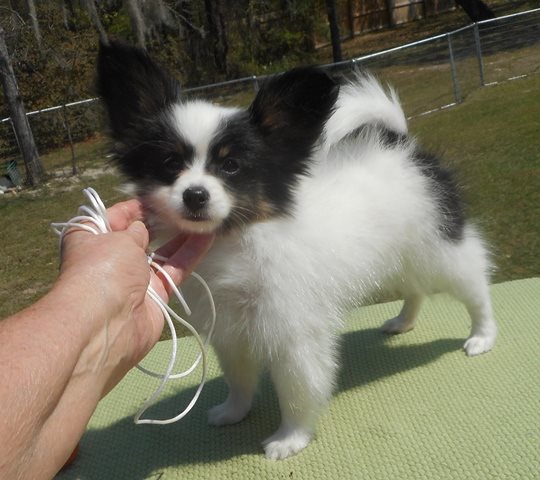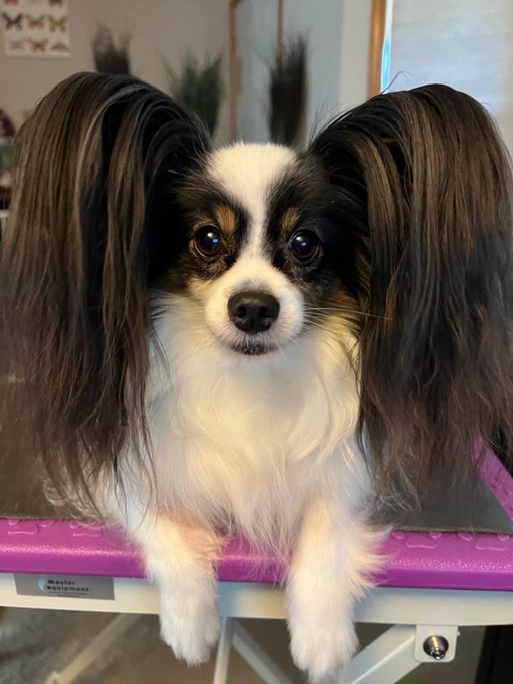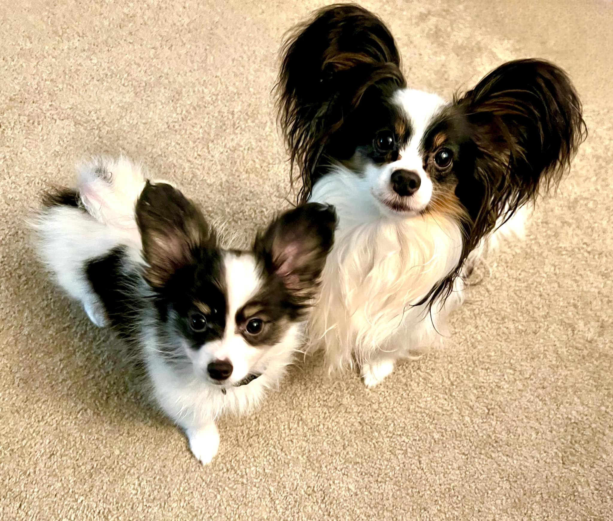 Connie came to us from the Sunshine State (Florida) back in the fall of 2021. She is a beautiful Tricolor girl who is a huge lover and lap dog. She loves other dogs and gets along well with every dog she has met. Connie is a little more aloof than my other Papillons. She will sit back watch for a bit, then come in to be your best friend. Connie is a huge pleaser and wants to make sure you are happy. She likes to take care of her people by licking your hands and feet and enjoys sitting on me or near me every chance she gets. She is an alert barker and will let me know if someone is outside, otherwise she is quiet. Connie has been a joy to live with and is easy to groom. She is a wonderful, attentive mother who loves her puppies and teaches them all of life’s greatest lessons right up until the day they leave.